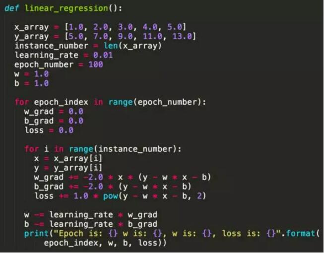 下面是一个最简单的线性回归 Python 实现,模型是简单的 y = w * x + b。