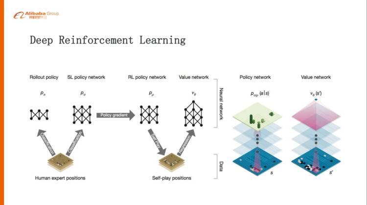 强化学习跟深度学习结合,就叫深度强化学习。因为深度学习或者神经网络是非常适合去做这种表示学习的,可以表示成一个复杂的函数。policy或者value用神经网络去逼近的话,在工程上或者效率上是非常好的提升。以AlphaGo的例子来讲,在训练的时候分成三个阶段,第一个阶段,从人类的棋谱里面学习人类的先验的知识,通过监督学习学习一个还好的、胜率比较高的policy network,第二个阶段,基于监督学习学习出来的policy network,然后自我对弈,通过policy gradient再去优化policy network,这就比之前学出来的policy network要更好。第三阶段,再用学出来的强化学习版的policy network自我对弈,得到一个最佳的。