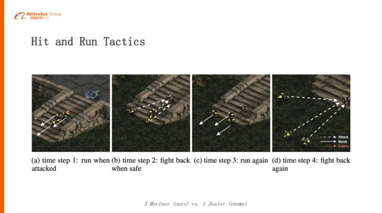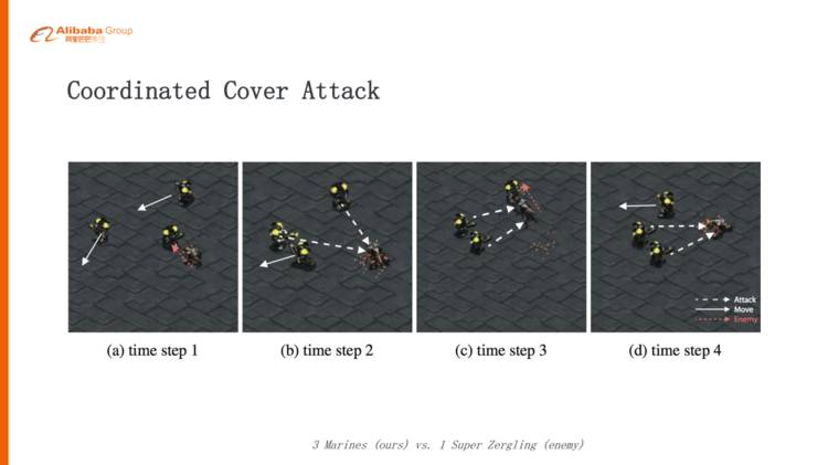 这个例子就是三个枪兵打一个Super的小狗,这个小狗是我们编辑过的,血量非常大,一下子打不死。三个枪兵打一个小狗,a/b这两个图,在训练的早期其实是没有学会太多的配合意识,所以他们走位的时候经常会发生碰撞,经过可能几万轮的训练以后,他们慢慢学会了配合队友的走位,这样大家撞不到一起。