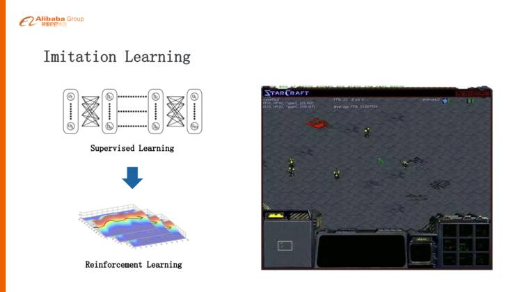 我们觉得值得去研究和探讨的是模仿学习,Imitation Learning,刚刚讲的AlphaGo的例子也是Imitation Learning,第一步通过监督学习学习比较好的策略,再把监督学习学好的策略通过自我的对弈去提升,在《星际争霸》里面更需要这种模仿学习,比如说我们两个枪兵打一个小狗的时候,我们认为一个好的策略是一个枪兵吸引小狗在那儿绕圈,然后另外一个枪兵就站在中心附近开枪,把这个小狗消灭,两个枪兵一滴血可以不死。但是这种策略是比较难学习的,所以我们先给它人为的让这个枪兵在里面画圈,画上几步之后枪兵自己学会画圈了,带着小狗,然后另外一个枪兵在后面追着屁股打,这种探索就非常的有效。
