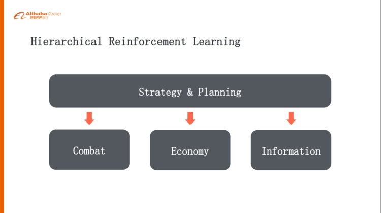 要玩一个full-game,如果是简单的单层次的强化学习,可能解决不了问题,因为action space实在太大了,一个比较自然的做法就是做层级式的方式,可能上层是策略规划,下面一层就是它的战斗、经济发展、探路、地图的分析等等,这样的话一层一层的,就是高层给下层设置一个goal,下层再给下面一层设计一个goal,其实这跟人的问题分解是比较类似的。