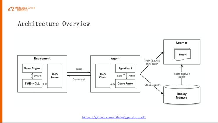 左边是Environment,其实就是《星际争霸》这个游戏,包括引擎,还有里面的DLL,DLL基于BWEnv,这是一个官方认可的DLL。基于这个BWEnv DLL把内部的状态、指令封装起来,其实这就是一个Server;
