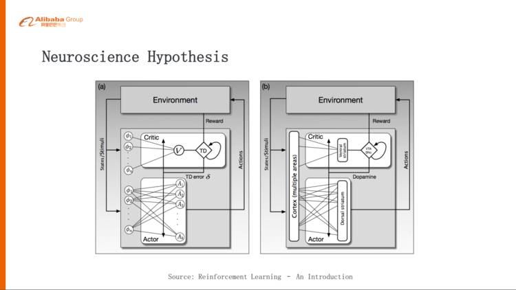 其实我们的Actor-Critic网络在人脑里面也是有相应的对应,左边就是Actor-Critic这个网络,右边是我们的大脑,大脑里边纹状体就是负责Actor、Critic两部分,这个纹状体腹部是负责Critic这部分,背部是负责Actor这部分,Reward下来以后我们大脑会计算,这与预期的Reward有什么差距,这个差距就会以多巴胺的形式影响到Actor,下一次你就要按照这个去调节,让下一次Action做的更好一点。