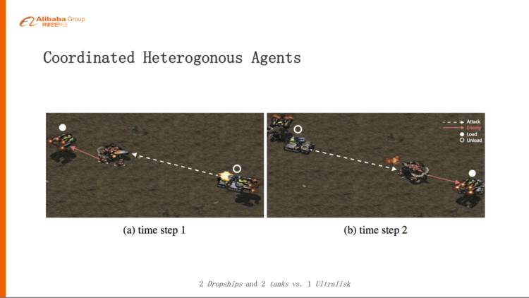 这个例子就是,两个运输机,每个运输机带一个坦克去打一头大象,正常来讲,两个坦克打一个大象肯定是打不过的,加上运输机的配合以后,大象攻击某一个坦克的时候,运输机会及时的把这个坦克收起来,让大象扑空,同时另外一个运输机赶紧把它的坦克放下去,去攻击大象,这样一来一回可能大象一点便宜占不到就被消灭了,这个是基于我们之前的做出BiCNet一个协作的展现。