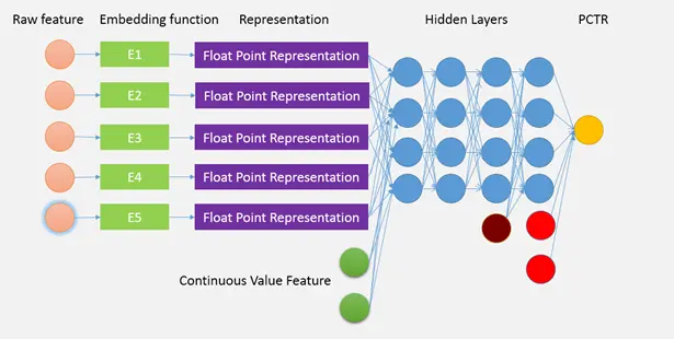 随着深度学习的逐渐成熟,越来越多的人希望把深度学习引入 CTR 预估领域,然而由于广告系统包含海量 id 类离散特征,如果全用 one-hot 表示,会产生维度爆炸,DNN 不支持这么多维的特征。目前工业界方案是 FNN[4],即用 FM 做 Embedding,DNN 做训练。