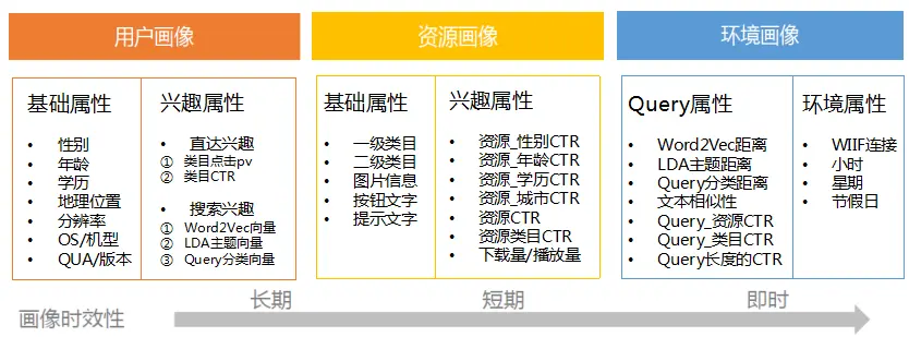 由于 GBDT 不善于处理大量 id 类离散特征(后文会讲到),但是却善于处理连续的特征,一般的做法是用各种 CTR 反馈特征来做交叉,来范化的表达信息。在这种情况下,信息会大量存在于动态特征中,而少量存在于模型中(对比 LR,信息几乎都存在于模型中)。下图是作者为搜索广告的 GBDT 模型设计的特征,读者可供参考。