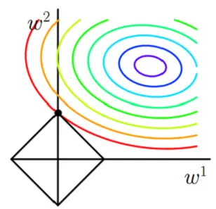 如上图:最优解出现在损失函数的等值线和约束函数 L1 相切的地方,即凸点,而菱形的凸点往往出现在坐标轴上(系数 w1 或 w2 为 0),最终产生了稀疏性。