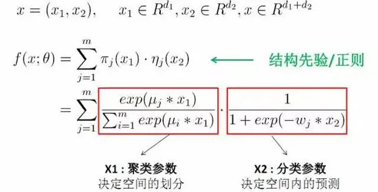 上图公式可以看到,左边聚类部分用 softmax 做分区函数并决定样本空间的划分,右预测部分用 sigmoid 做拟合函数,并决定空间内的预测。