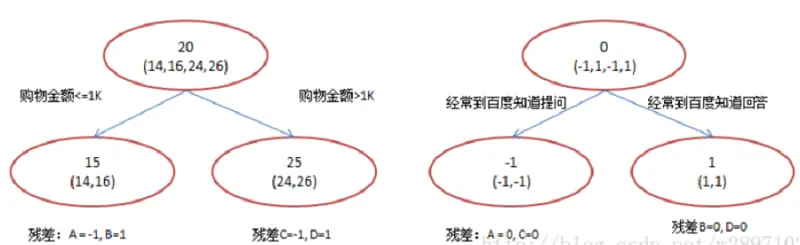 b. 回归树(Regression Tree):注意,这里使用的是回归树而非决策树,通过最小化 log 损失函数找到最靠谱的分支,直到叶子节点上所有值唯一 (残差为 0),或者达到预设条件(树的深度)。若叶子节点上的值不唯一,则以该节点上的平均值作为预测值。