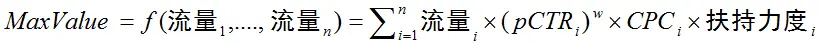 ( 指数项 w 是一个调节因子,用于平衡用户体验和收入。扶持力度用于调节各个广告渠道 )