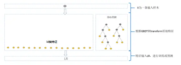 预测时,会先走 GBDT 的每棵树,得到某个叶子节点对应的一个离散特征(即一组特征组合),然后把该特征以 one-hot 形式传入 LR 进行线性加权预测。