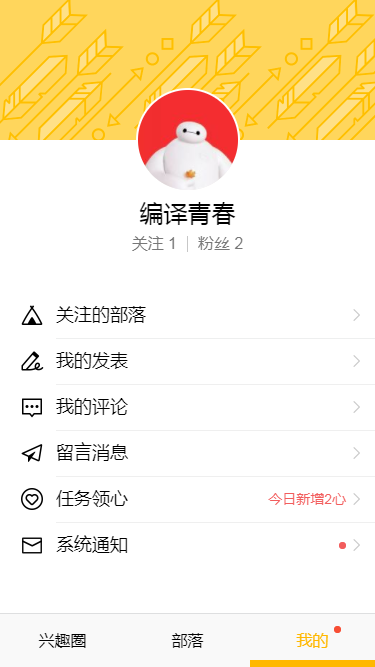 看下图,在兴趣部落“我的”面板,“我的” Tab 会根据“留言消息”、“任务领心”和“系统通知”的红点而确定,也就是说只要这三者有一个有红点,那么“我的” Tab 上就会有红点,一般情况下“留言消息”和“系统通知”没有红点,而“任务领心”产品经理给的需求是:有红点时点进去就消除红点,如果之后再做一些加心的操作,那红点重新出现。而加心的操作有很多,在很多页面用户都可能会做一些加心的操作,所以“任务领心”的红点会一会儿出现一会儿消失,紧随着的是“我的” Tab 上的红点也会一会儿出现一会儿消失。问题就出现在这,因为“我的” Tab 是首页的一部分,所以每次进入首页时都要跟服务器请求一次,而首页的 PV 是非常巨大的,相对应的红点状态的请求数量也非常巨大。所以想到的一个策略就是当用户操作加心时,利用 localStorage 设置一个标志位,回到首页时就读取 localStorage 里的标志位,根据这个标志位来判断是否显示红点,当点击“任务领心”时,就把标志位归位。这样,顿时减少了上亿的请求。