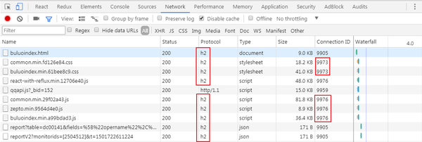 看上面的图片,很多的资源加载的协议已经使用了 HTTP/2,再看 Connection ID 一栏,你会发现有的资源的 Connection ID 是一样的,这说明什么呢?这就是 HTTP/2 中的一个很重要的特性:多路复用。除了多路复用,当然还利用了 HTTP/2 的一些其他特性。