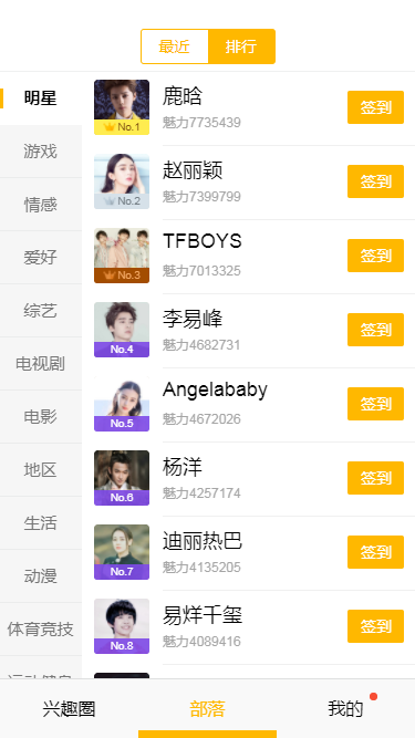 首页选择最上面的“排行”菜单时,只会加载类目列表以及明星列表的部分内容,当下拉明星列表时,还会根据需要再次向服务器请求列表后面的内容。