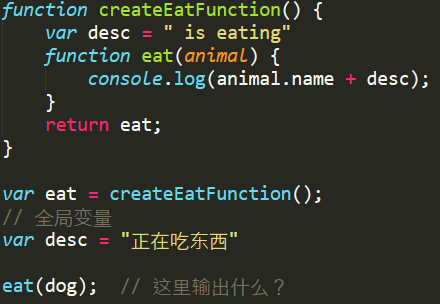 现在这个eat函数还能再使用createEatFunction()函数的desc这个变量吗? 或者在调用它的时候会使用外边的全局desc 变量? 从而输出 "dog 正在吃东西”?