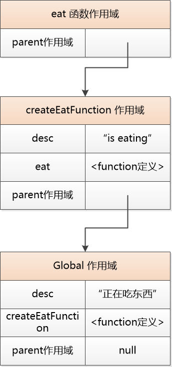 小王子看着这个图,马上就明白了,这个eat函数没有定义desc 这个变量, 所以就沿着链去查找, 在createEatFunction作用域去查找,如果还找不到,就到global 作用域中查找......