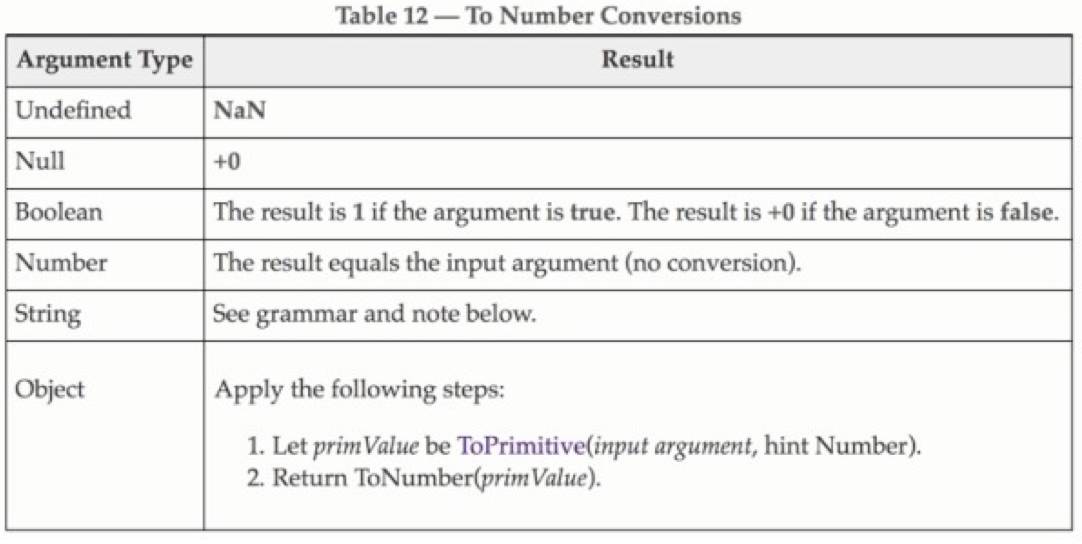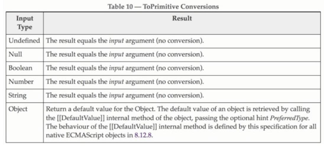 这一节的内容讲述的就是加号操作符的计算方法。将两个值先执行一个 ToPrimitive 操作,而对于这个操作,ECMAScript 规范中也原原本本给出了一张对照表。