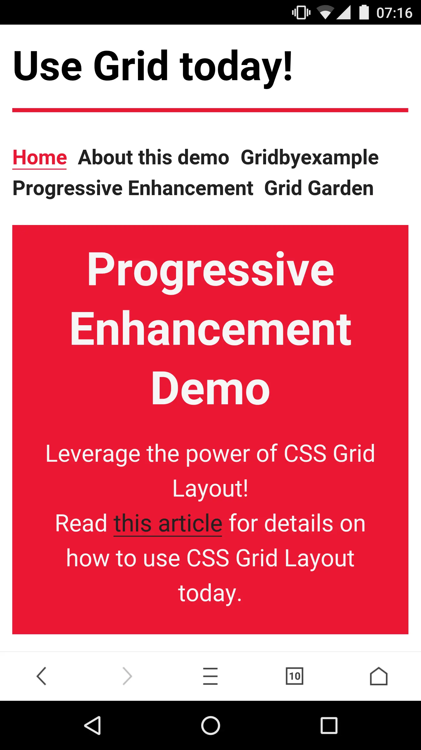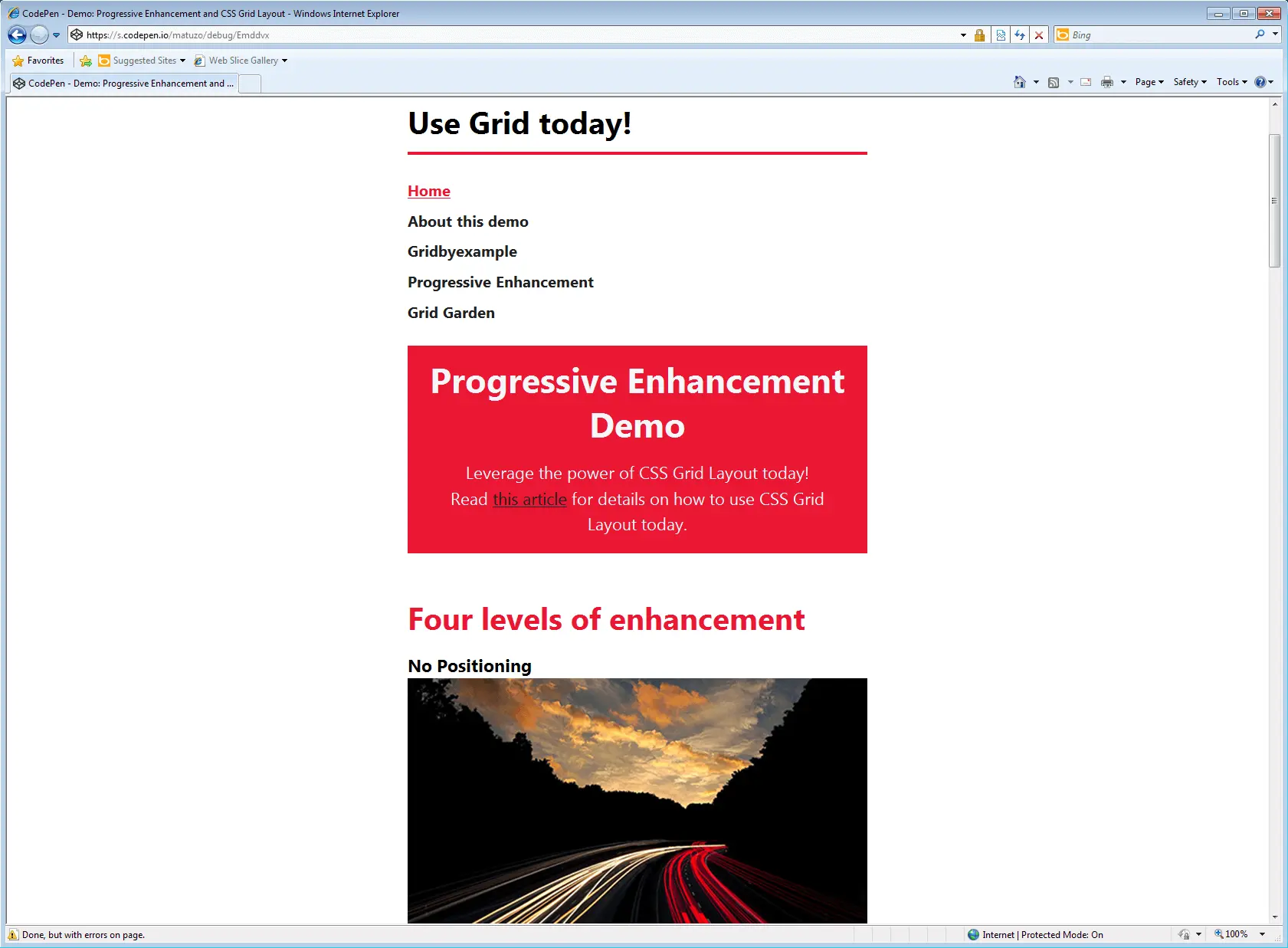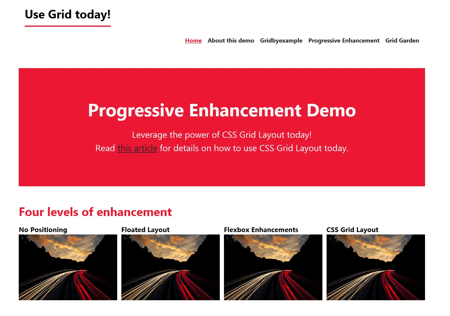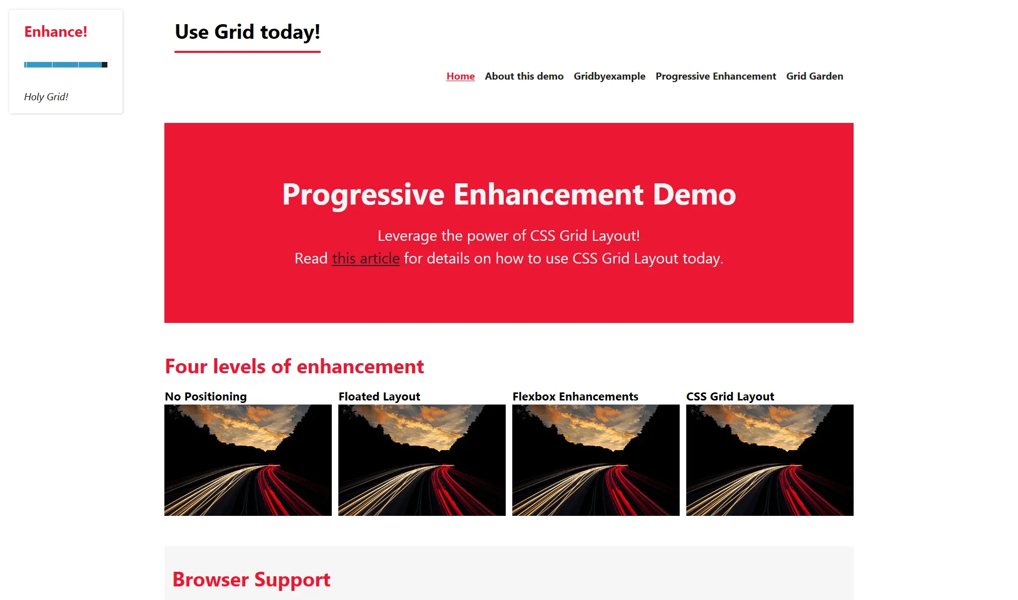 当你打开这个 demo, 你会发现自己在一个基本布局的网站的主页上。您可以调整左上角的滑块以增强您的体验。布局从非常基本到基于浮动的布局,再转换为 基于 flexbox 的布局,最后是基于 CSS Grid 的布局。