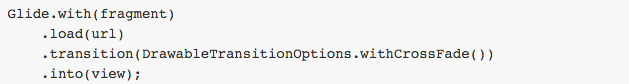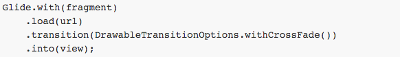 TransitionOptions是和你要加载的资源的类型绑定的,也就是说,如果你请求一张位图(Bitmap),你就需要使用BitmapTransitionOptions,而不是DrawableTransitionOptions。因此,你请求的这张位图,你需要用简单的淡入,而不能用 交叉淡入(DrawableTransitionOptions.withCrossFade())。 如果既不是Bitmap也不是Drawable可以使用GenericTransitionOptions