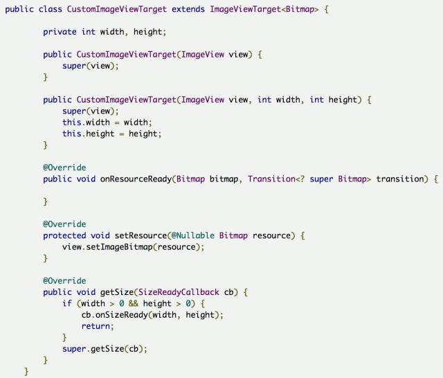 我这里指定的View的类型是ImageView,资源类型是Bitmap,可根据需要修改,onResourceReady(Bitmap bitmap, Transition<? super Bitmap> transition)方法中可以通过bitmap获取图片的尺寸。