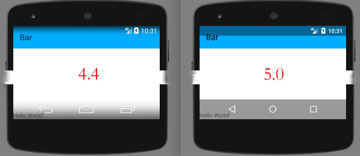 并且设置AppTheme为应用主题,然后分别运行在Android 4.4和5.0上。我们会看到如下效果