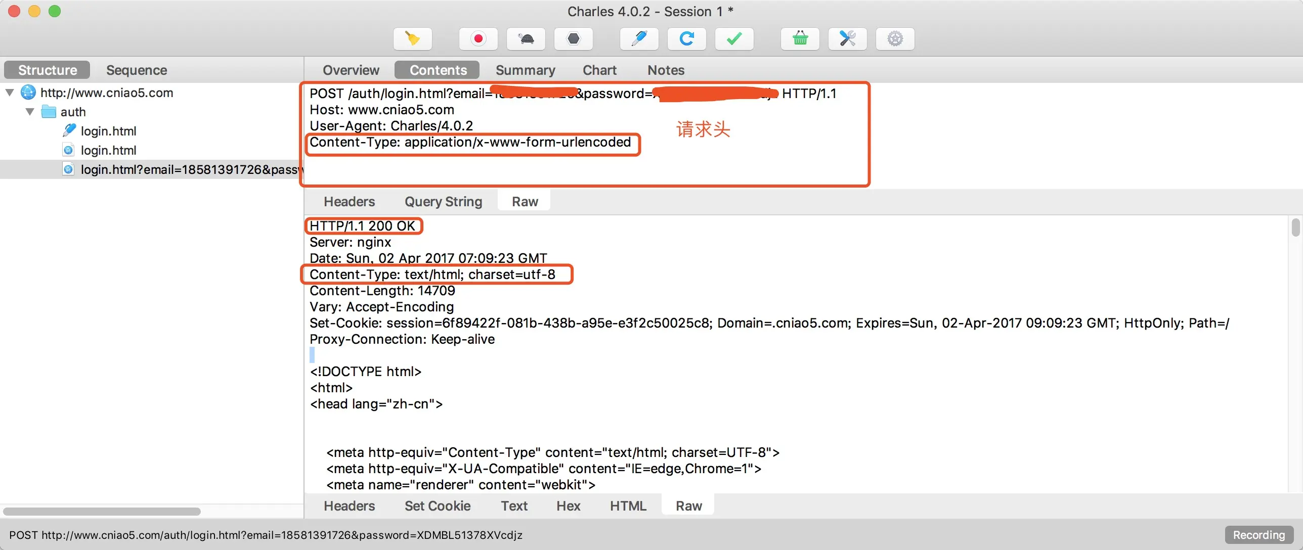 请求方法为 post,请求地址是菜鸟窝登录地址:www.cniao5.com/auth/login.… 。请求协议:HTTP/1.1。