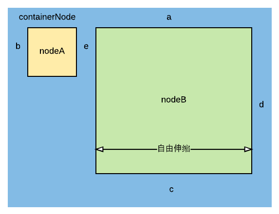 2)根据布局规则和nodeB自身样式属性maxWidth、minWidth、width、height、preferredSize,可以计算出其constrainedSize的minSize是CGSize(width: 0, height: 0),maxSize为CGSize(width: 375 - 100 - b - e - d, height: Inf+),因为nodeB的flexShrink和flexGrow均为1,也即当空间富余或者空间不足时,nodeB添满富余空间或压缩至空间够为止。