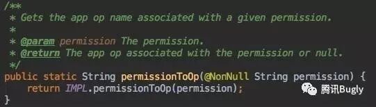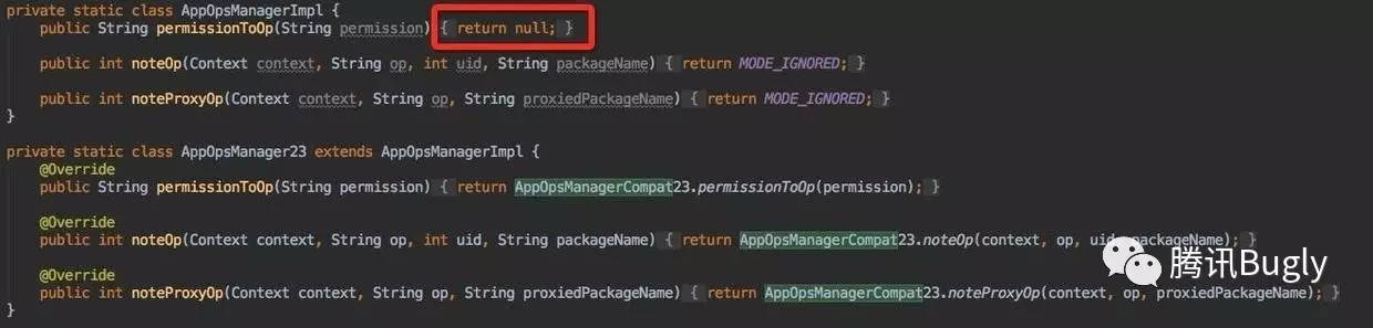 从上图可以看出:在api 23以下, AppOpsManagerImpl::permissionToOp 直接返回为null ,这直接导致api 23以下权限检查将会返回 granted ,因此,该方法在api 23 下,权限检查方法也会失效。