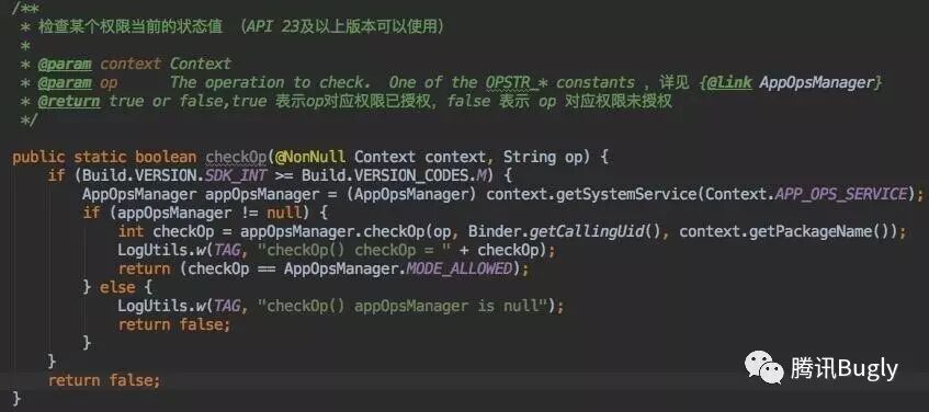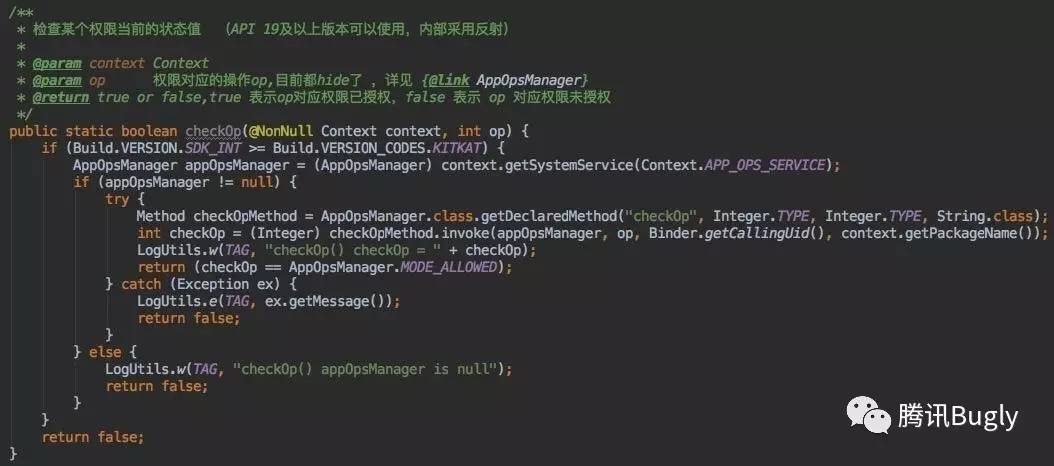 同时也仔细看了一下AppOpsManager 类介绍,并不是为开发者设计的,不过其他权限兼容可以使用这种方法,前提是 要看OP_*是在什么版本才有的,需做兼容方案 。
