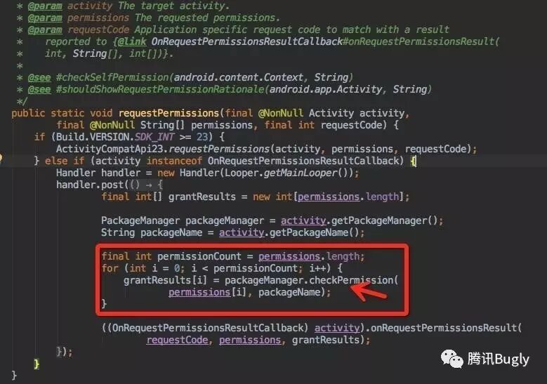 既然在6.0 可以使用Context::checkSelfPermisson进行权限检查,那能否使用support v4 中的ContextCompat::checkSelfPermisson 方法了,试一下,发现在api 23 以下失效,为了探究原因,查看了ActivityCompat::requestPermissons 内部实现,如下