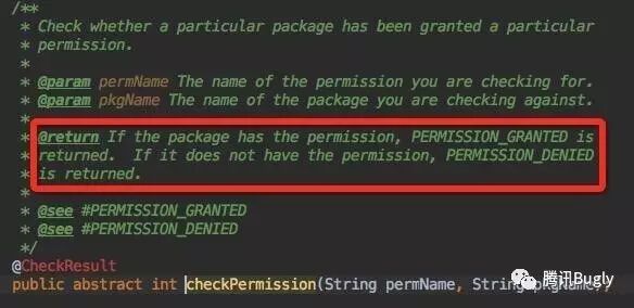 内部权限检查方法在api 23 以下,使用的是 PackageManager::checkPermission,再去查看PackageManager::checkPermission方法,如下:发现只要权限在AndroidManifest.xml中注册过,均会认为该权限granted ,因此上述方法在api 23 以下也失效。
