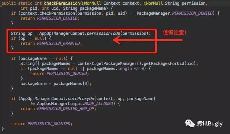 API 19以上 ,Google 官方提供了 AppOpsManager 类来检查权限,看到这个api 时,脑海浮现出 “天无绝人之路啊”,里面有两个比较重要的方法 :AppOpsManager::checkOp(int op ,int uid ,String packageName) (hide方法)和AppOpsManager::checkOp(String op,int uid ,String packageName)(public 方法 ,api 23 以上可用),不经思考,直接写出了如下两个方法