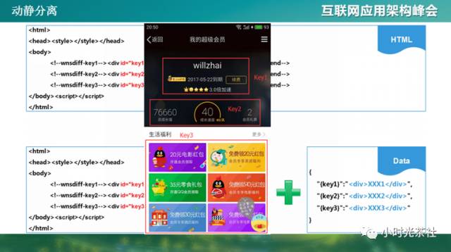 3、其实手Q也实现了一套离线包机制,用来缓存HTML和图片、CSS、JS等文件,但是只能缓存静态不变的内容,比如刚开始介绍QQ会员时的会员个性化红包页面就利用了离线包的能力。然而我们的页面有很多用户数据(比如会员身份、会员成长值、QQ等级成长速度等)需要实时查询,再加上终端复杂的离线包校验机制耗时很多,我们新建了HTML Cache机制,在终端缓存了整个HTML。