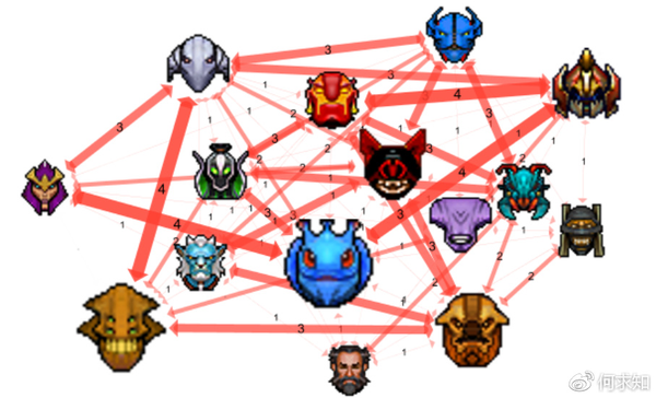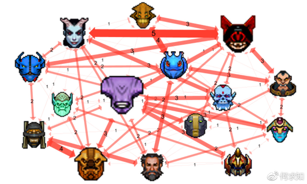 - 边的权重越大,表示两名英雄互坑的次数越多。其中帕克+沙王的组合,净胜场是-8,相爱相杀,坑的飞起。