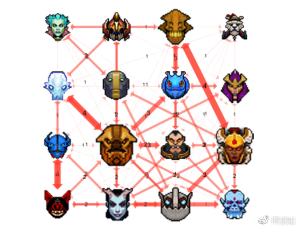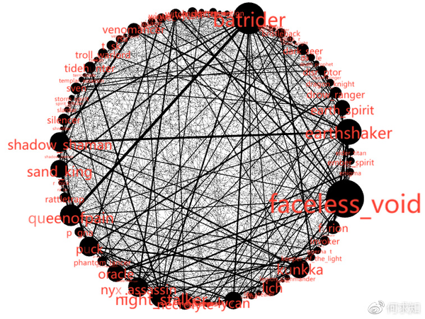 - 图中只展示了吃人次数>=4的克制关系。(注:这张图我觉得很有意思,DOTA2玩家可以从每一条边中找到很多故事~)