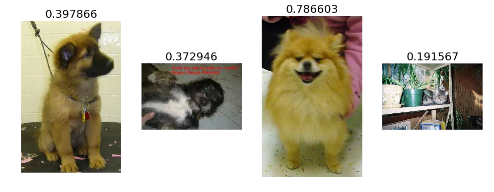 最后,这些是模型对其类别最不确定的一些图片。这意味着概率非常接近 0.5(1 代表是一只猫而 0 代表是一只狗)。第四张图片中的猫只有一张脸露出来。第一张和第三张图片是长方形的而不是原模型训练集中的正方形。