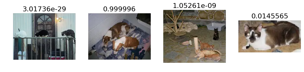 一个 epoch,也就是在数据集完整地跑一遍,在我的 Amazon p2 实例上花费了 10 分钟时间。在这个例子里数据集是包含 23000 张图片的训练数据集,另外的 2000 张图片被保留下来作为验证数据集。在这里我决定使用 3 个 epoch。在验证数据集上的准确度在 98% 左右。训练好模型之后,我们可以看一些被正确分类的图片。在这个例子里,我们用图片中是一只猫的概率作为结果。1.0 表示模型非常自信地认为图片中是一只猫,而 0.0 则表示图片中是一只狗。