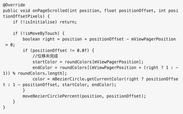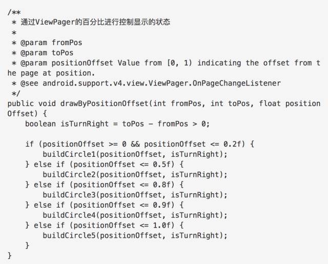 因为ViewPager在0页到1页的过程中position是0,positionOffset是0-0.9直到当滑动完成后变成了0,1页到0页的过程中positionOffset是从0.9 - 0,position是0,因此这里就是模拟这样子的参数而编写代码。