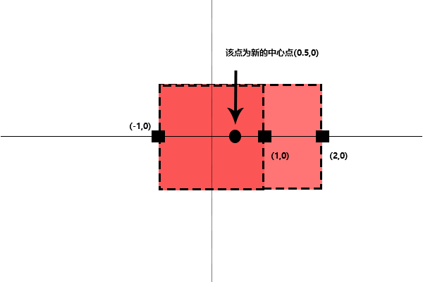 可以看到正方形,通过将右边的左边的点进行平移1个单位后,中心点从(0,0)变化至(0.5,0)。通过这个公式p4.x + (p2.x - p4.x) / 2,这里我们将p2.x = 2,p4.x = -1,通过计算得出了0.5,因此这就是为什么要这么写的原因了。
