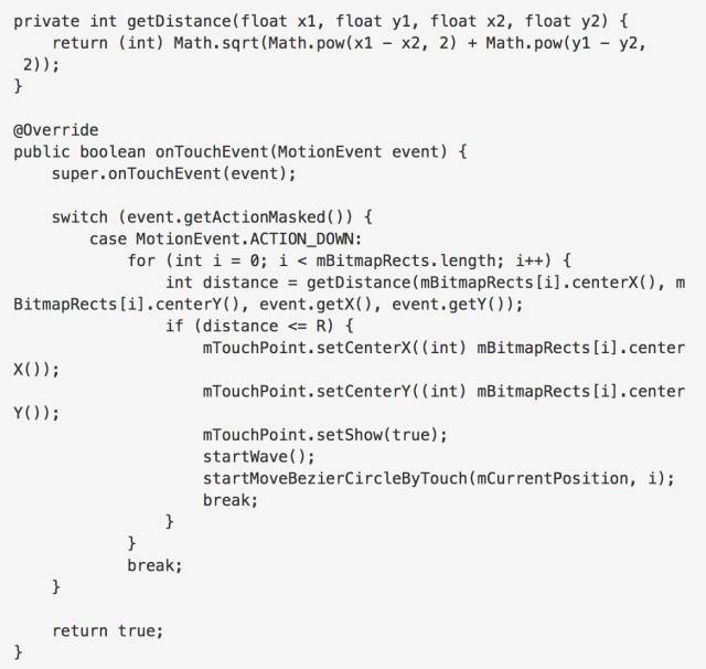 通过两点之间的距离公式,判断是否在点击的区域范围内,然后通过startWave()方法进行显示点击的涟漪效果,通过startMoveBezierCircleByTouch方法进行从当前位置,跳转的指定的位置的平移变换。