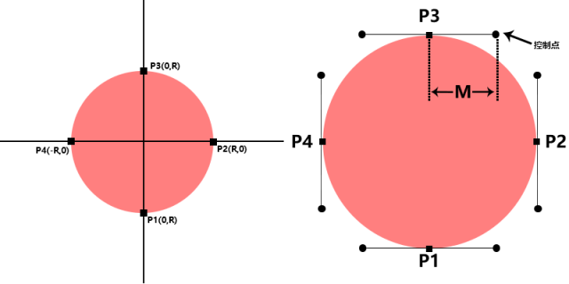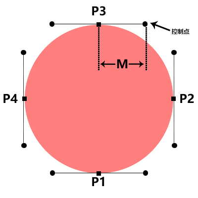 P1 P2 P3 P4分别是圆上的4个端点,它们连线的圆点即为该点的控制点。M为控制点到圆点的距离,那么M值的大小直接影响了曲线变化!