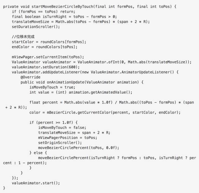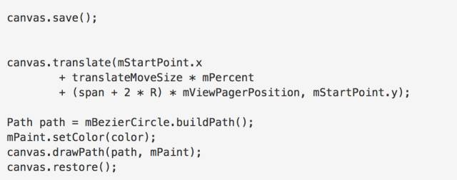 translateMoveSize是小球移动的一个单位的距离,mPercent是移动的百分比,mViewPagerPosition当前Page的位置。mStartPoint.x 先让小球平移到初始位置,然后加上 (span + 2 R) mViewPagerPosition当前页滑动页的距离,然后加上滑动的百分比在滑动距离上的比值,计算出最后的平移距离。
