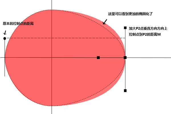 通过下图我们可以看到如果单纯将P2点垂直方向上的控制点的距离进行增大,图形的右边就更加的椭圆了,因为要对称,所以同时改变P2点和p4的垂直方向上M的距离,就可以让这两边的曲线更加接近椭圆。