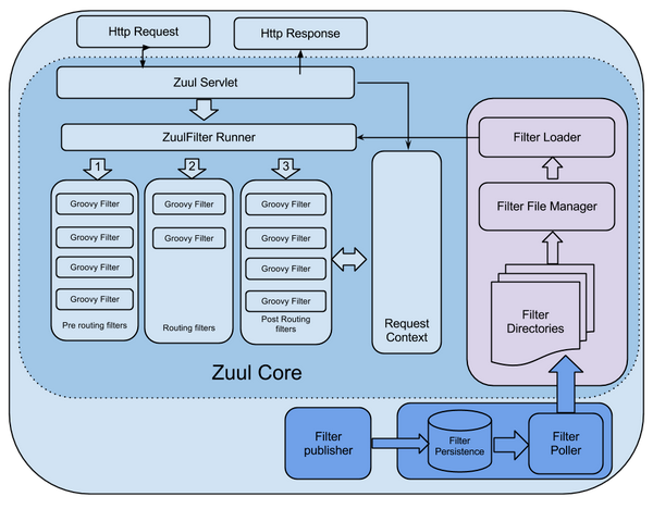 在zuul中, 整个请求的过程是这样的,首先将请求给zuulservlet处理,zuulservlet中有一个zuulRunner对象,该对象中初始化了RequestContext:作为存储整个请求的一些数据,并被所有的zuulfilter共享。zuulRunner中还有 FilterProcessor,FilterProcessor作为执行所有的zuulfilter的管理器。FilterProcessor从filterloader 中获取zuulfilter,而zuulfilter是被filterFileManager所加载,并支持groovy热加载,采用了轮询的方式热加载。有了这些filter之后,zuulservelet首先执行的Pre类型的过滤器,再执行route类型的过滤器,最后执行的是post 类型的过滤器,如果在执行这些过滤器有错误的时候则会执行error类型的过滤器。执行完这些过滤器,最终将请求的结果返回给客户端。