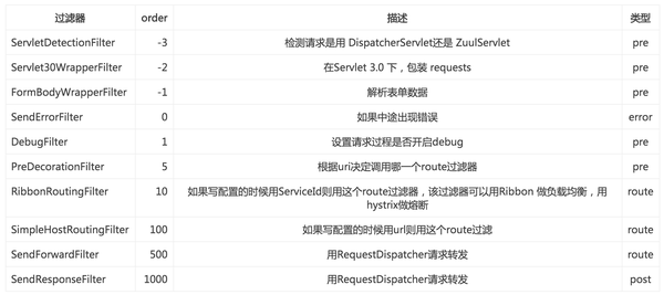 Zuul默认注入的过滤器,它们的执行顺序在FilterConstants类,我们可以先定位在这个类,然后再看这个类的过滤器的执行顺序以及相关的注释,可以很轻松定位到相关的过滤器,也可以直接打开 spring-cloud-netflix-core.jar的 zuul.filters包,可以看到一些列的filter,现在我以表格的形式,列出默认注入的filter.