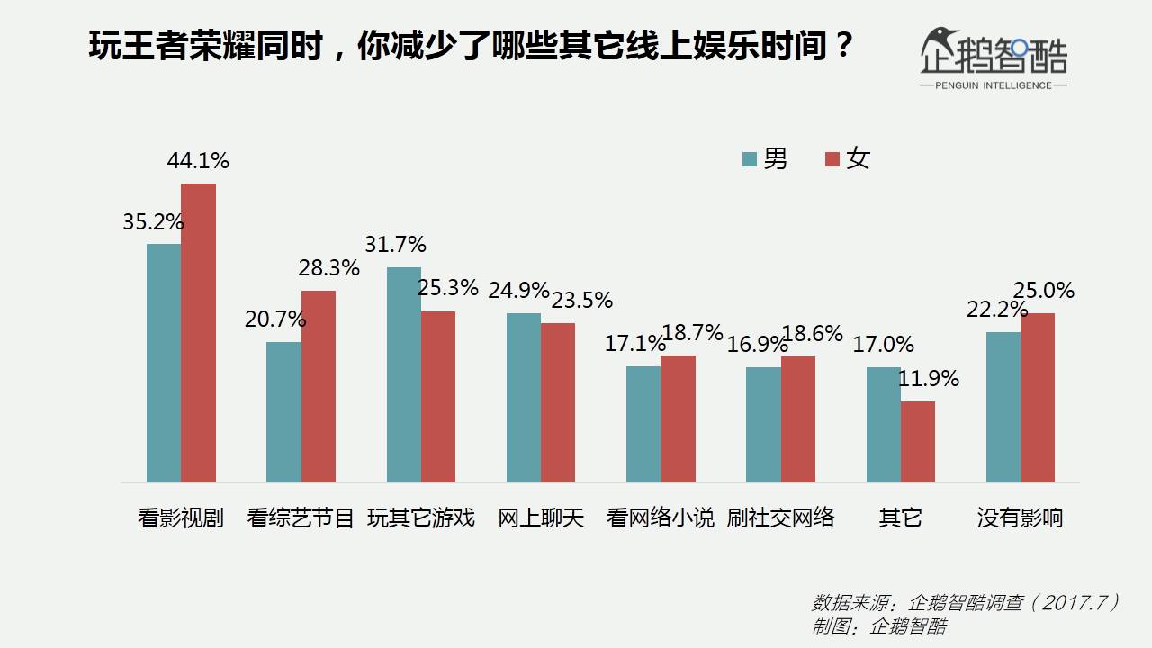 此次调研中我们关注的一个焦点,是王者荣耀对其他娱乐消费的替代性,以及男女用户之间的差异。从数据中可以看出,只有不到四分之一玩家,他们的其他娱乐生活没有受到王者荣耀的代替。