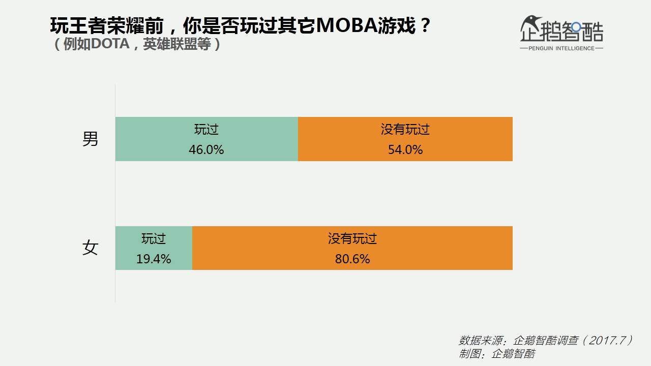 玩王者荣耀的女性玩家里,80.6%此前没有玩过DOTA或英雄联盟这类MOBA游戏。男性玩家里有54%没有玩过。