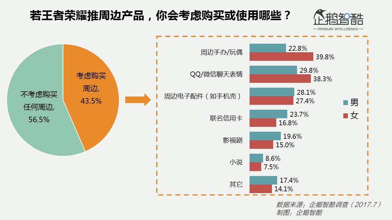从我们对王者荣耀的玩家调研来看,43.5%的用户表示会考虑购买这款游戏的周边产品,且女性玩家表现出了更强烈的周边偏好。