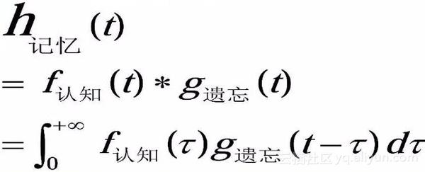 类似地,记忆其实也是一种卷积的结果。假设认知函数是 f(t) ,它代表对已有事物的理解和消化,随时间流逝而产生的遗忘函数是g(t),那么人脑中记忆函数 h(t) 就是函数是 f(t) 跟g(t) 的卷积,可用如下公式表示。