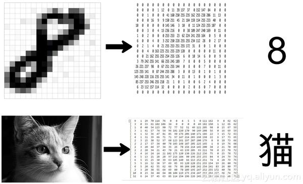 对于如图10-1所示的左侧的图像,正常人很容易判定出,图像中分别是一个数字“8”和一只猫。但是,对于计算机而言,它们看到数字矩阵(每个元素都是0到255之间像素值),至于它们据此能不能判定出是数字“8”和猫,这要依赖于计算机算法,这也是人工智能的研究方向。